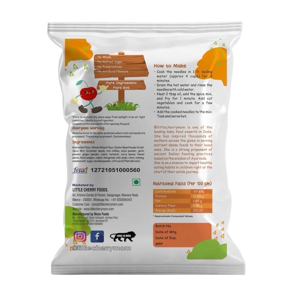 Introducing “Kodo Millet Instant Noodles” by LittleCherryMom, a nutritious and delicious meal option that contains no maida, no refined sugar, no palm oil, and is not fried. These easy-to-cook instant noodles are rich in vitamins and minerals, 100% vegetarian, and come with an all-natural taste made from natural spices for a yummy taste. Perfect for making healthy noodle recipes at home like Hakka noodles, Chow Mein, and Singapore-style noodles, our noodles are free from any preservatives, enhancers, artificial flavors, colors, trans fat, saturated fat, and cholesterol. Enjoy a wholesome and delightful meal with LittleCherryMom’s Kodo Millet Instant Noodles! Now, no more NO for Noodles