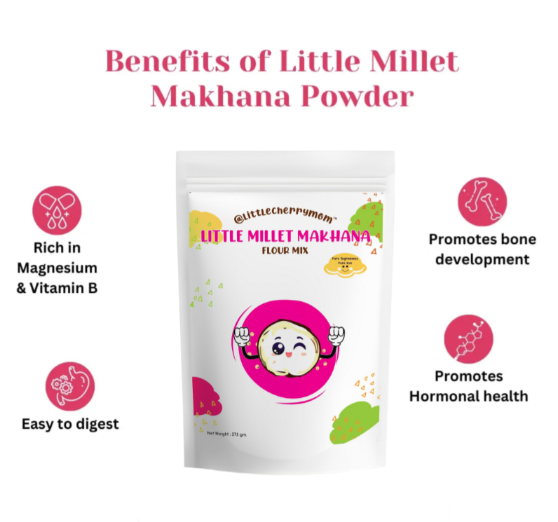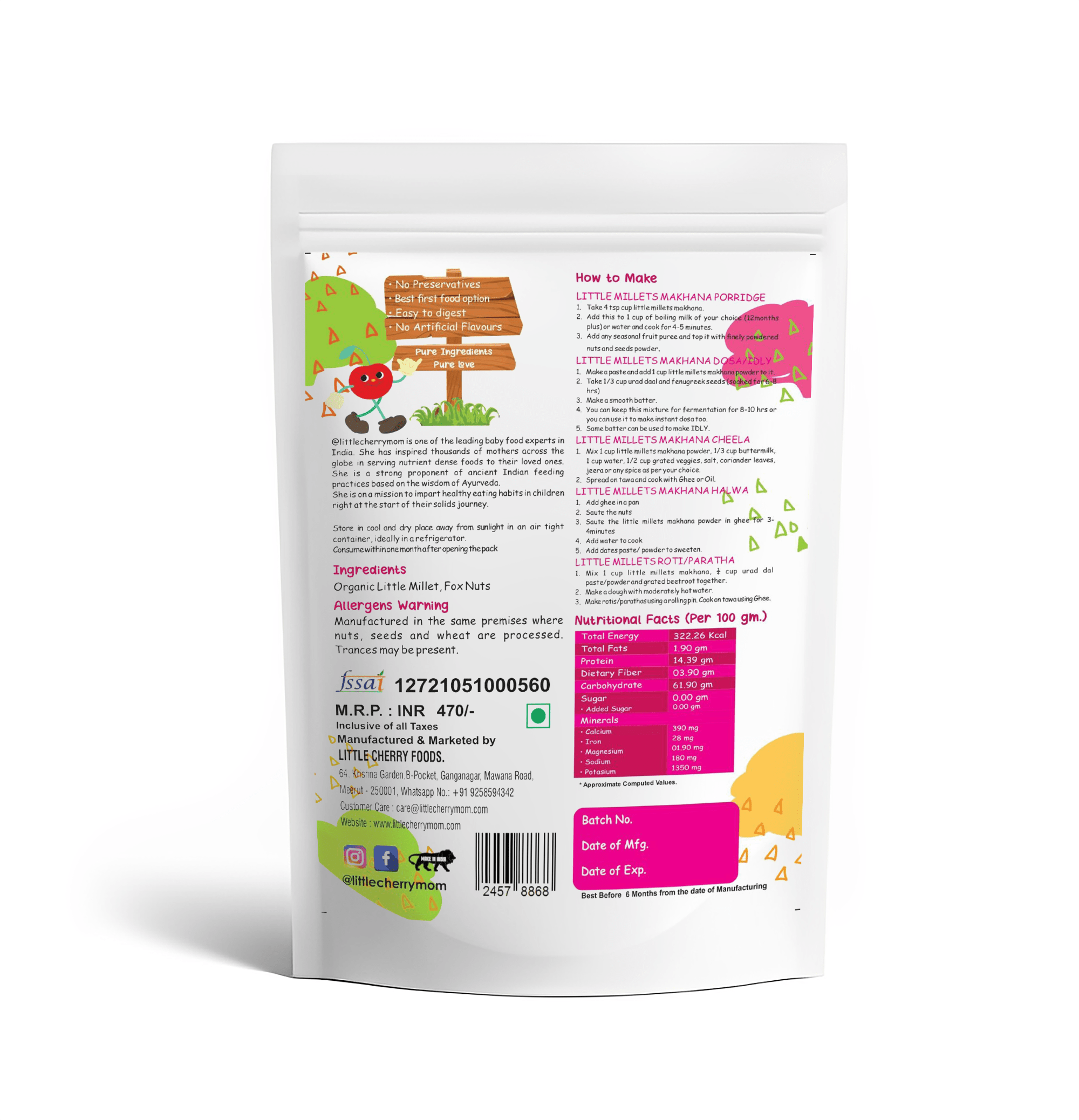 - Littlecherrymom’s Little Millet Makhana mix for babies and kids is the best choice as first food in Solid Journey. It is made with 80% Millet and 20% Makhana (Foxnut) also contains essential nutrients.