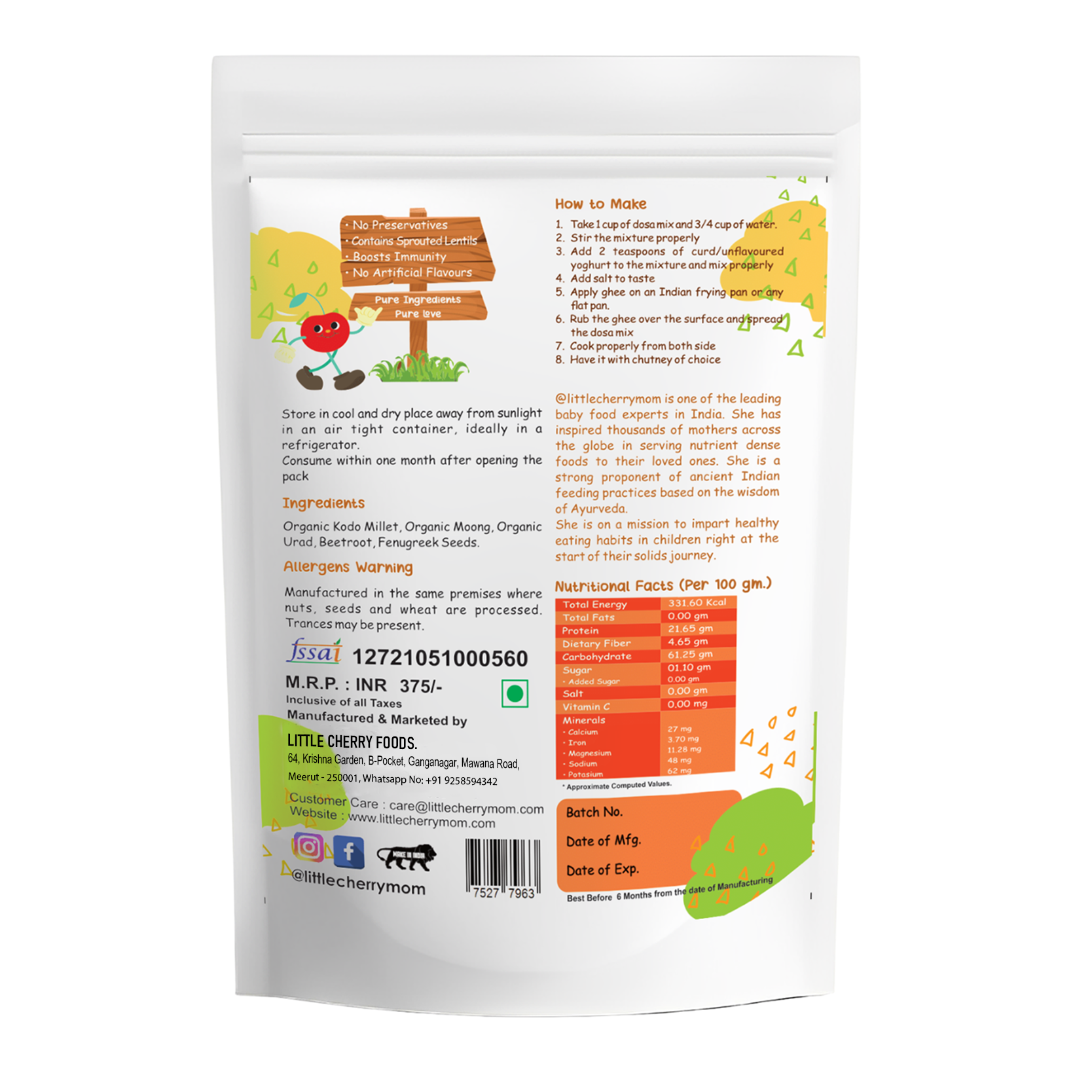 Introducing the Triple Immunity Booster Combo by LittleCherryMom, featuring Amla Powder, Nuts and Seeds Powder, and Kodo Millets Dosa Mix. This combo is designed to enhance your child’s immunity and overall well-being. The Amla Powder is rich in Vitamin C and antioxidants, making it perfect for boosting immunity in Indian kids. The Nuts and Seeds Powder contains a combination of essential nuts and seeds, rich in fatty acids and zinc, which are vital for maintaining a good appetite and supporting the growth of babies. The Kodo Millets Dosa Mix improves immunity and addresses stomach-related issues, ensuring your child stays healthy and strong. Give your child the best start with LittleCherryMom’s Triple Immunity Booster Combo!