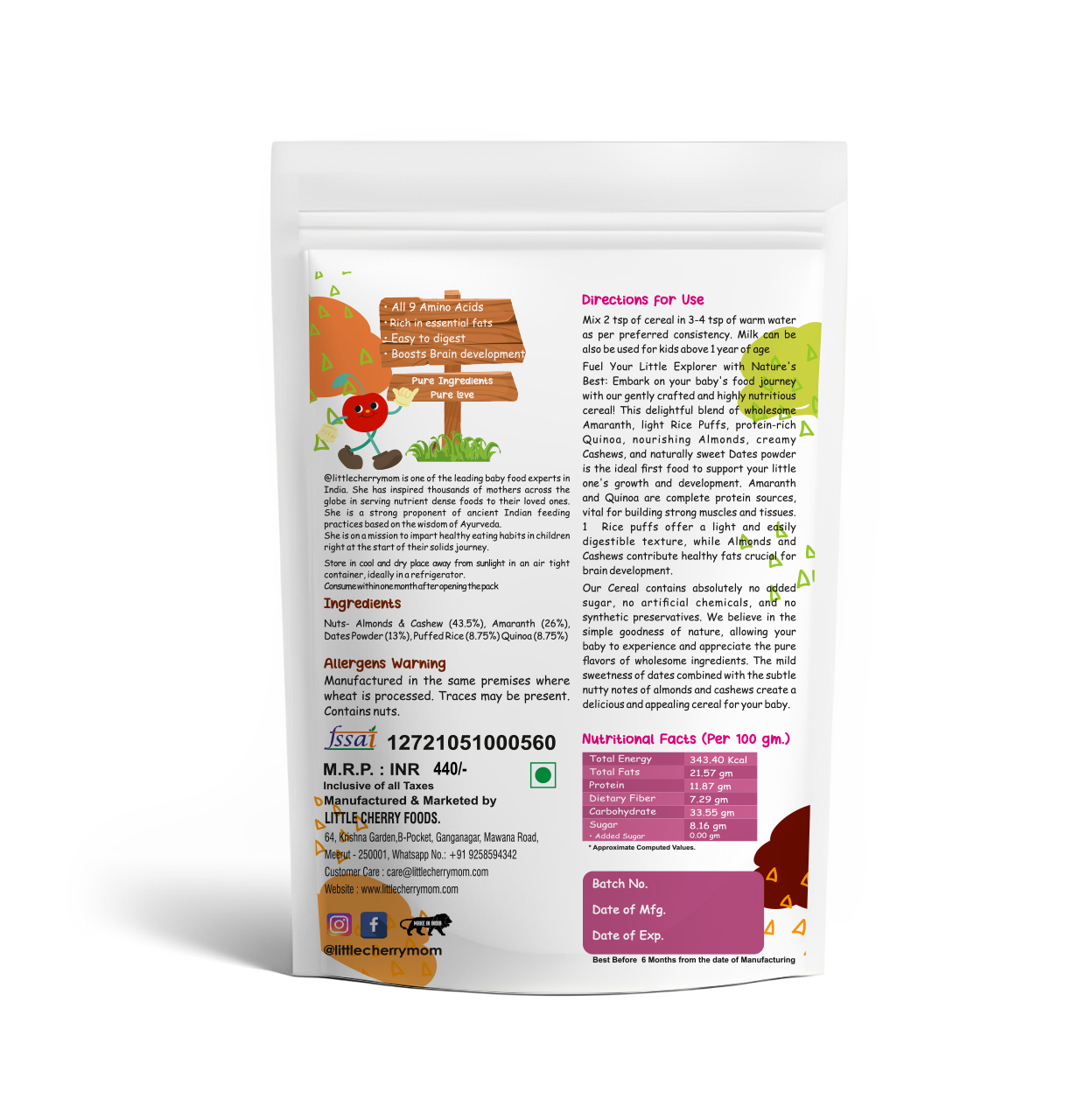 Give your baby a wholesome start with our nutrient-rich cereal made from Amaranth, Quinoa, Puffed Rice, Almonds, Cashews, and Dates.
